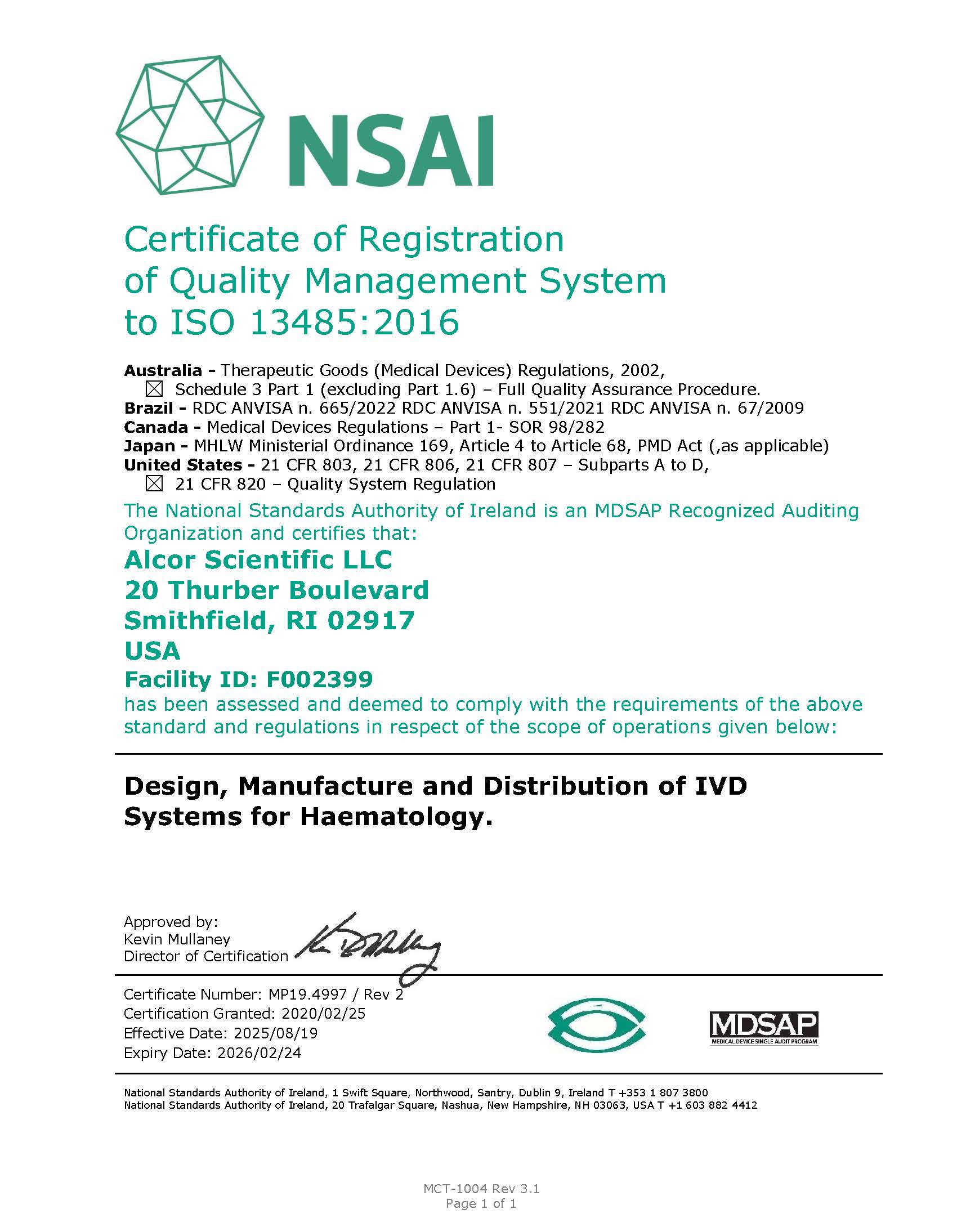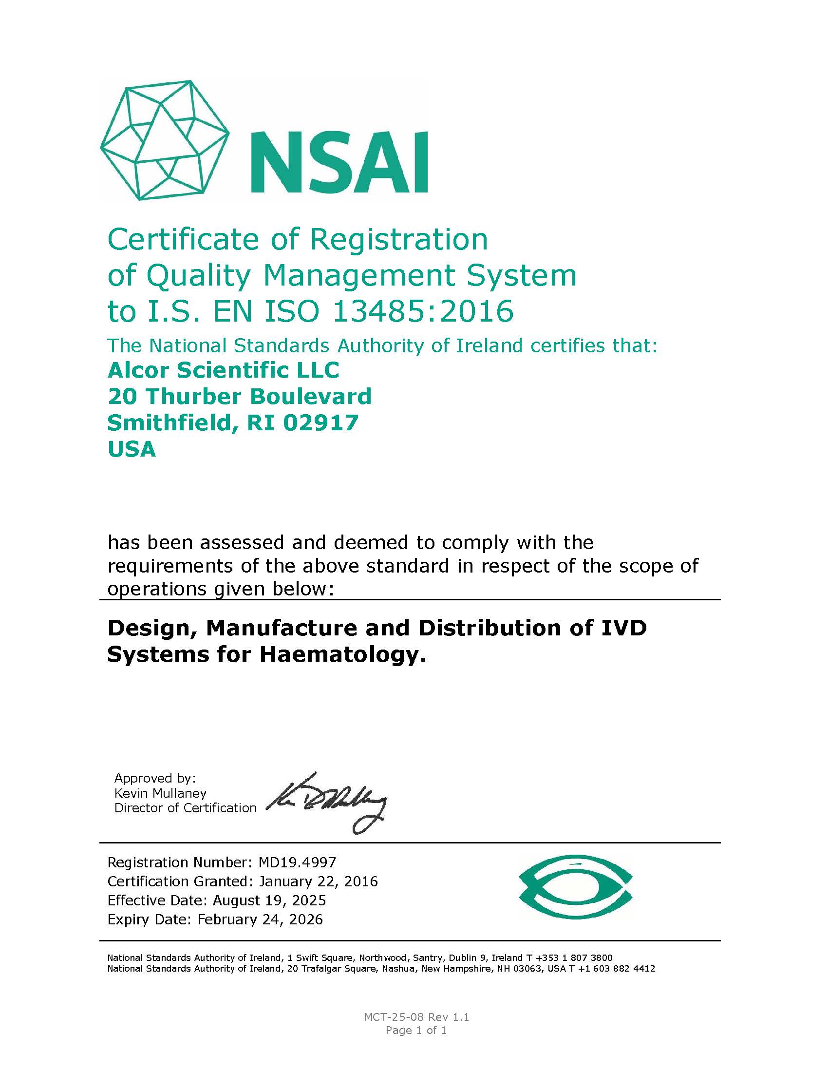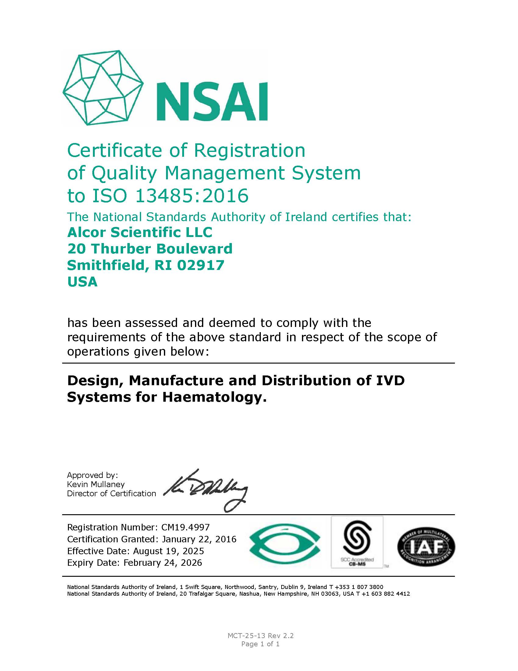 ALCOR® Scientific is proud to be ISO 13485 certified. We are committed to meeting the highest standards set by our customers and providing quality products that exceed consumer expectations. ALCOR® Scientific maintains strict adherence to current Good Manufacturing Practices (cGMP).